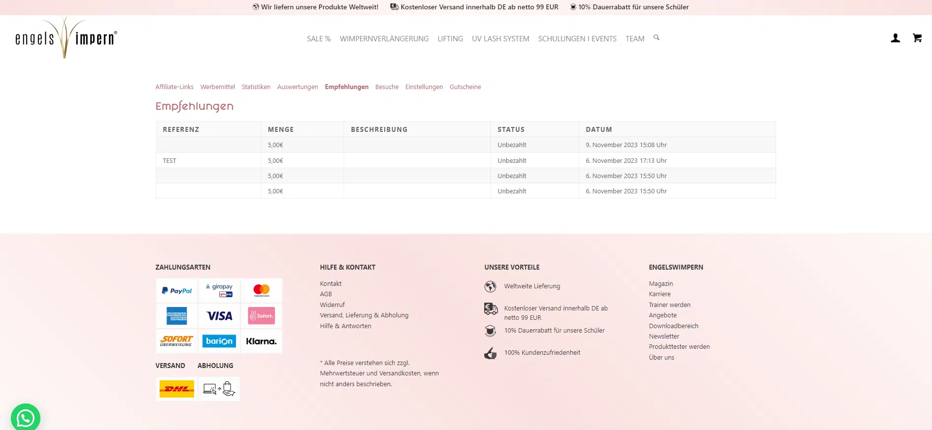 Status der Empfehlungen: Jede Empfehlung wird mit einem Status versehen, der Aufschluss darüber gibt, ob die betreffende Bestellung vom Kunden beglichen wurde oder nicht. Die Berechtigung zur Provisionsausschüttung erfolgt unmittelbar nach erfolgreicher Zahlung.